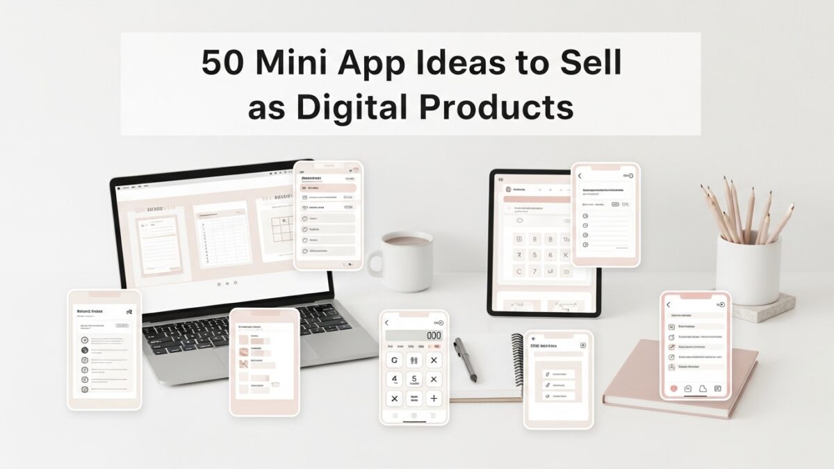 Mini apps are small single-purpose browser tools sold as HTML file downloads โ no installation needed. The best mini app ideas to sell include finance calculators, productivity timers, business pricing tools, health trackers, and life planning generators. They sell for $15โ$47 on Etsy, competition is still low, and AI tools can build them without any coding knowledge. This list covers 50 specific ideas organized by category so you can pick one and start building today.